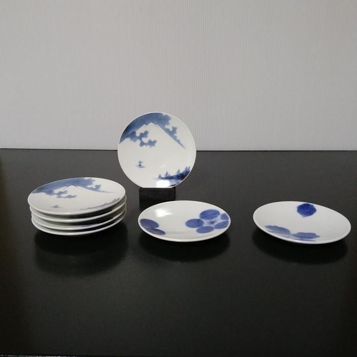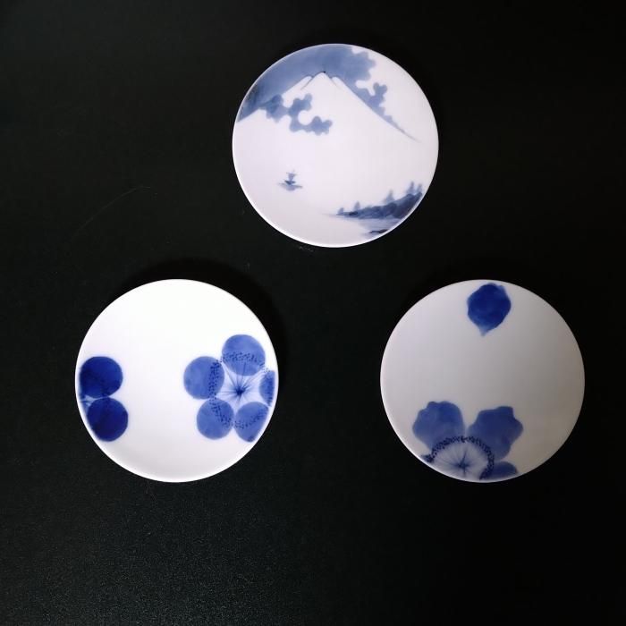 三寸平皿(奥:山水富士文絵/左:梅絵/右側:桜文)